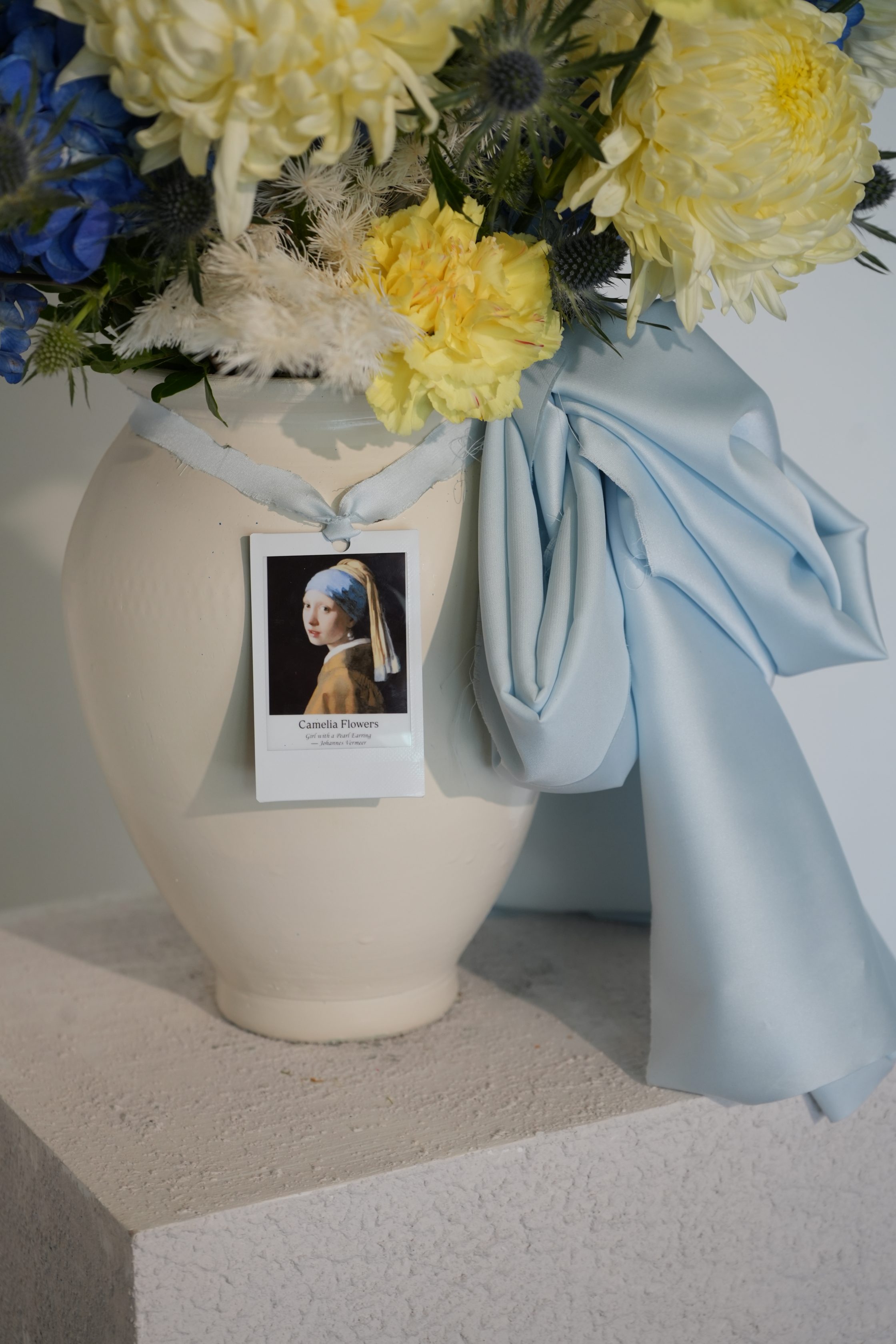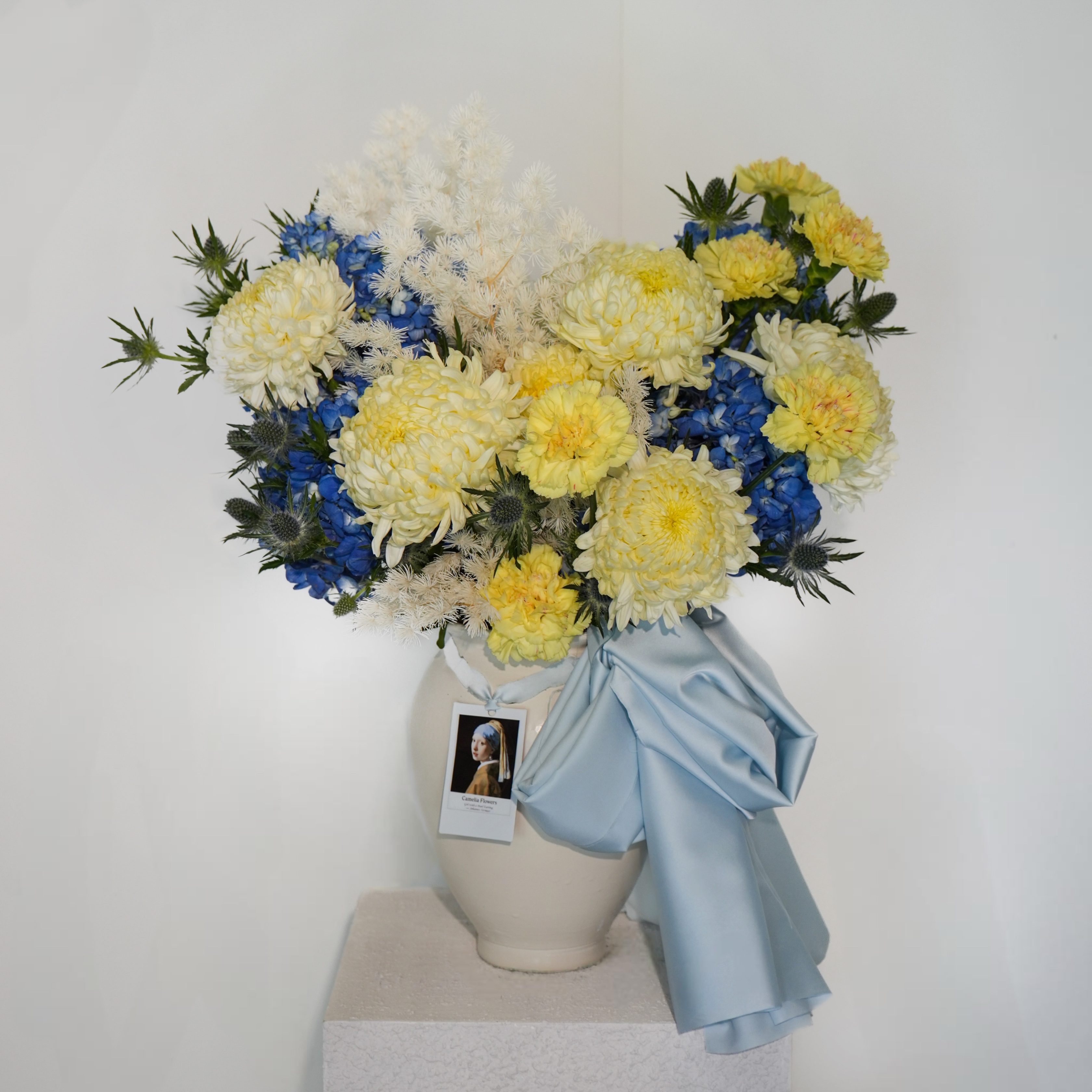 Inspired by Vermeer’s Girl with a Pearl Earring, this elegant arrangement captures quiet beauty and soft contrast.