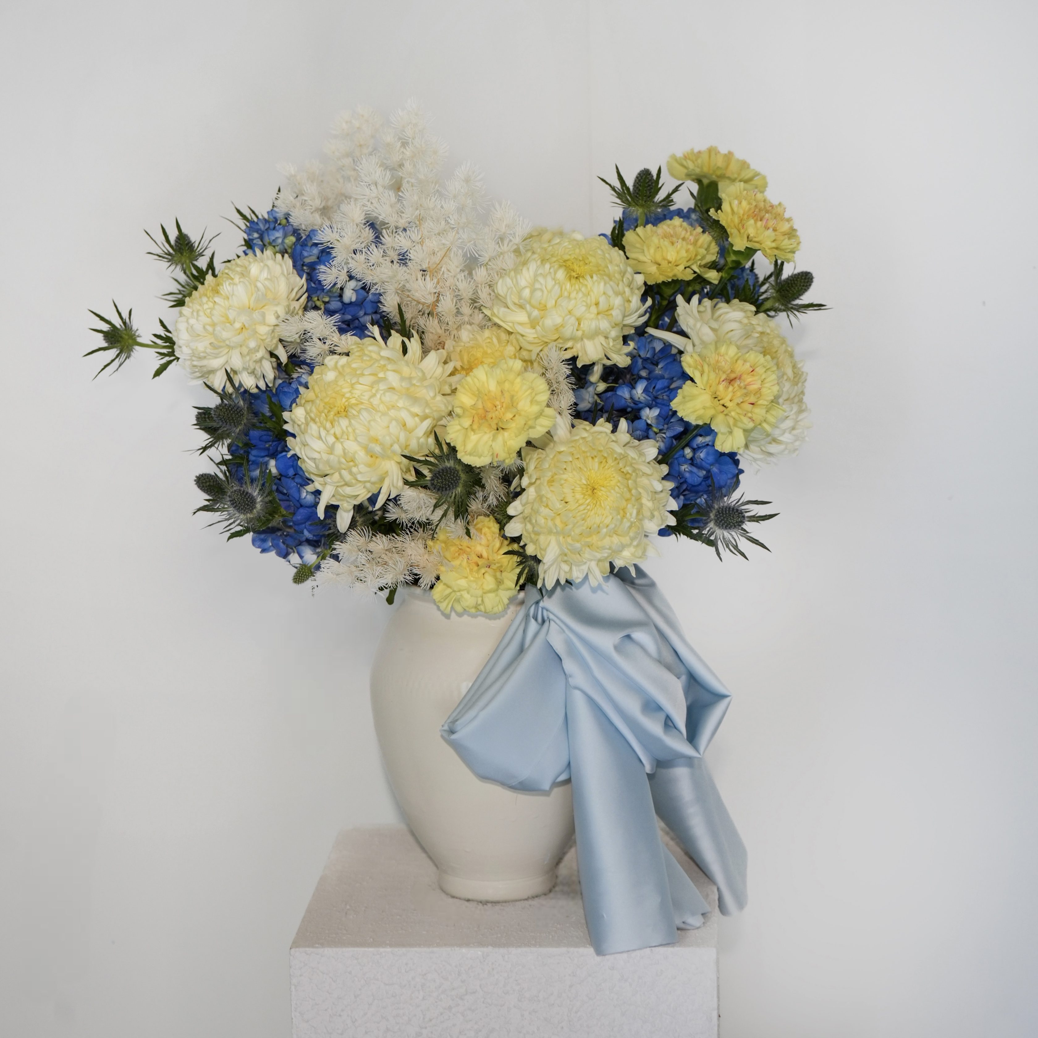 Hydrangea and chrysanthemum reflect delicate light, while carnation adds gentle color and grace.