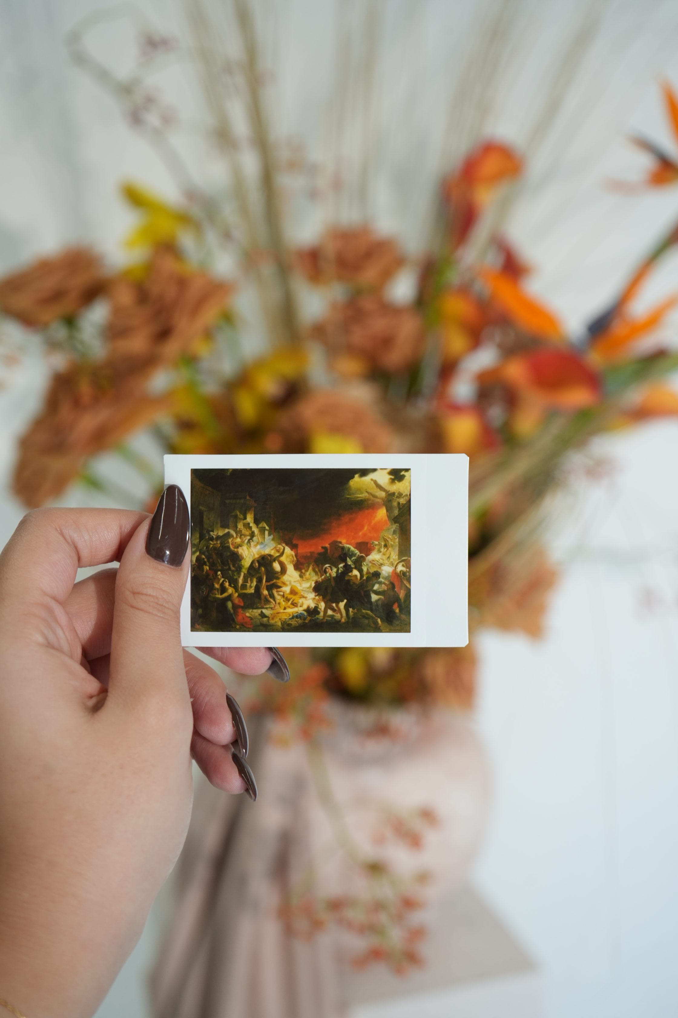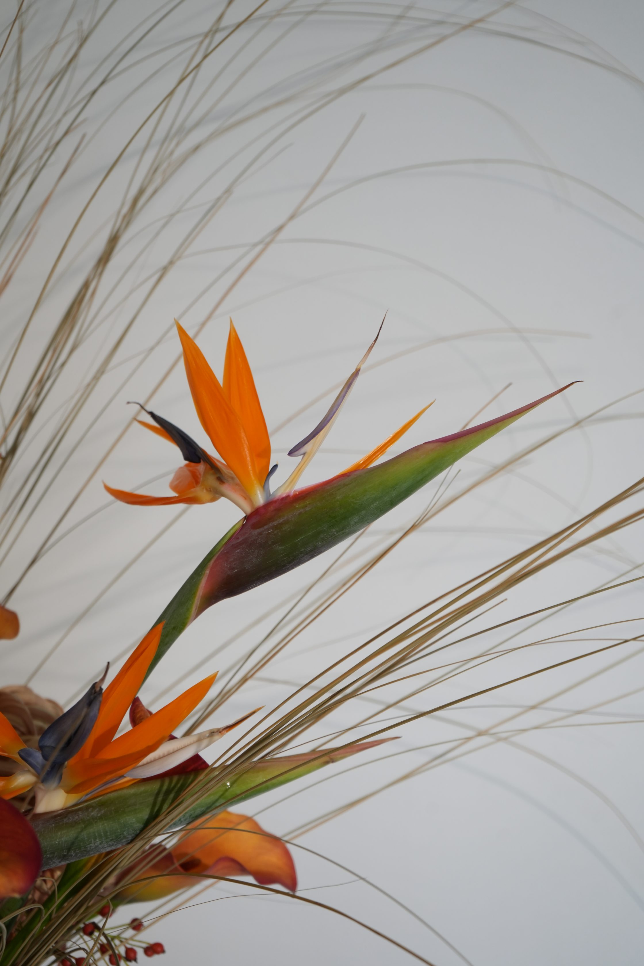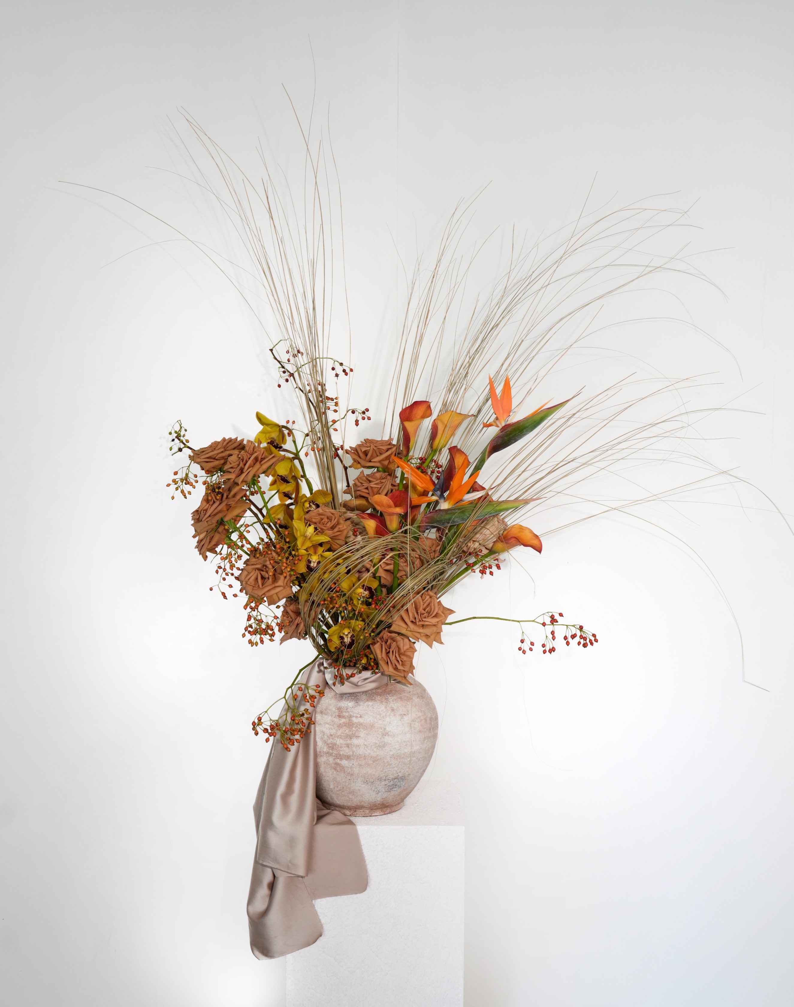 A dramatic arrangement inspired by The Last Day of Pompeii, featuring bold Strelitzia and Calla for fire and strength, softened by Toffee roses and Cymbidium mini.
