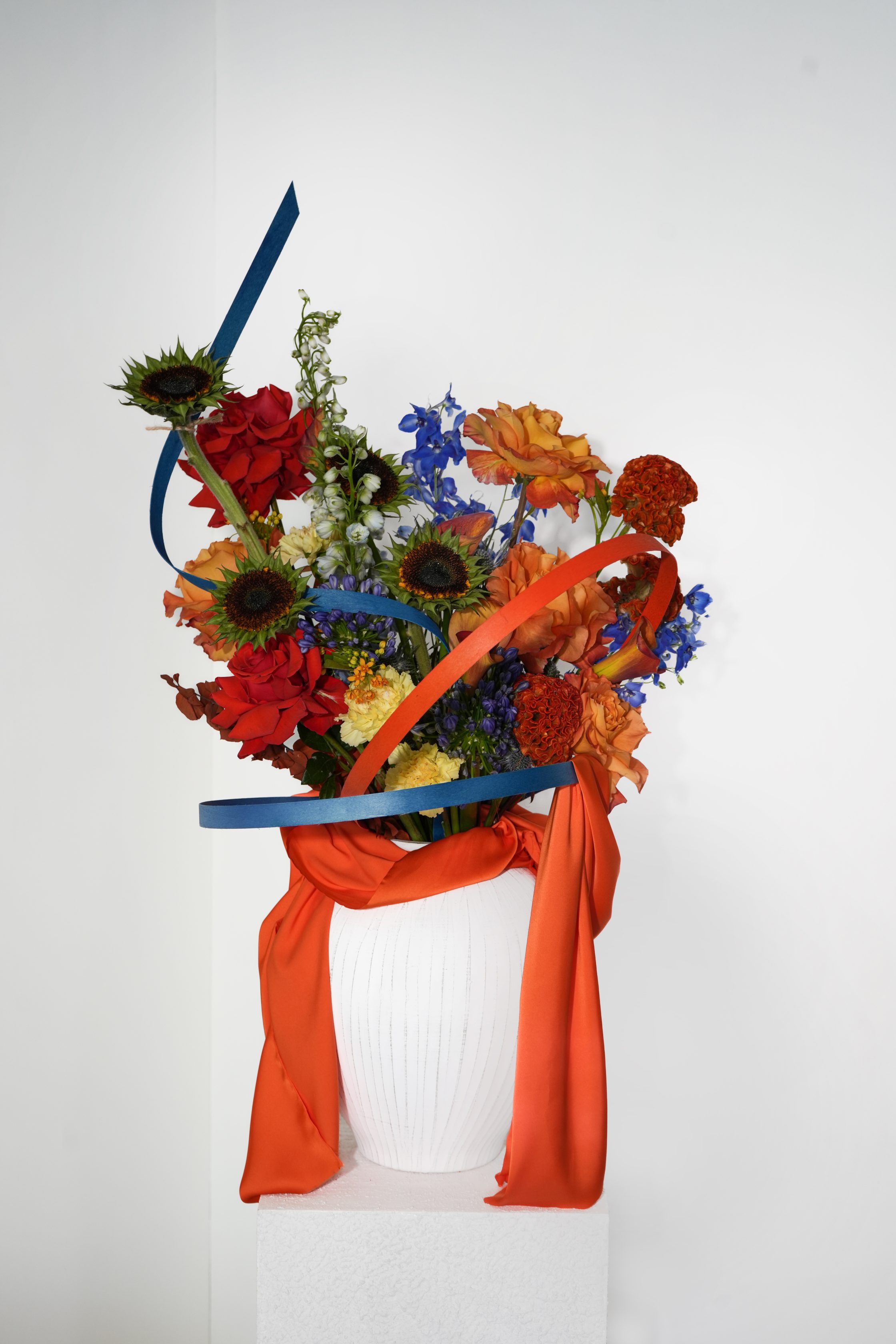 Delphinium, agapanthus, and asclepias bring contrasting cool tones and energy, while calla, nina, and carnation add balance and form. Bamboo and cloth create striking lines that echo the painting’s dramatic movement.