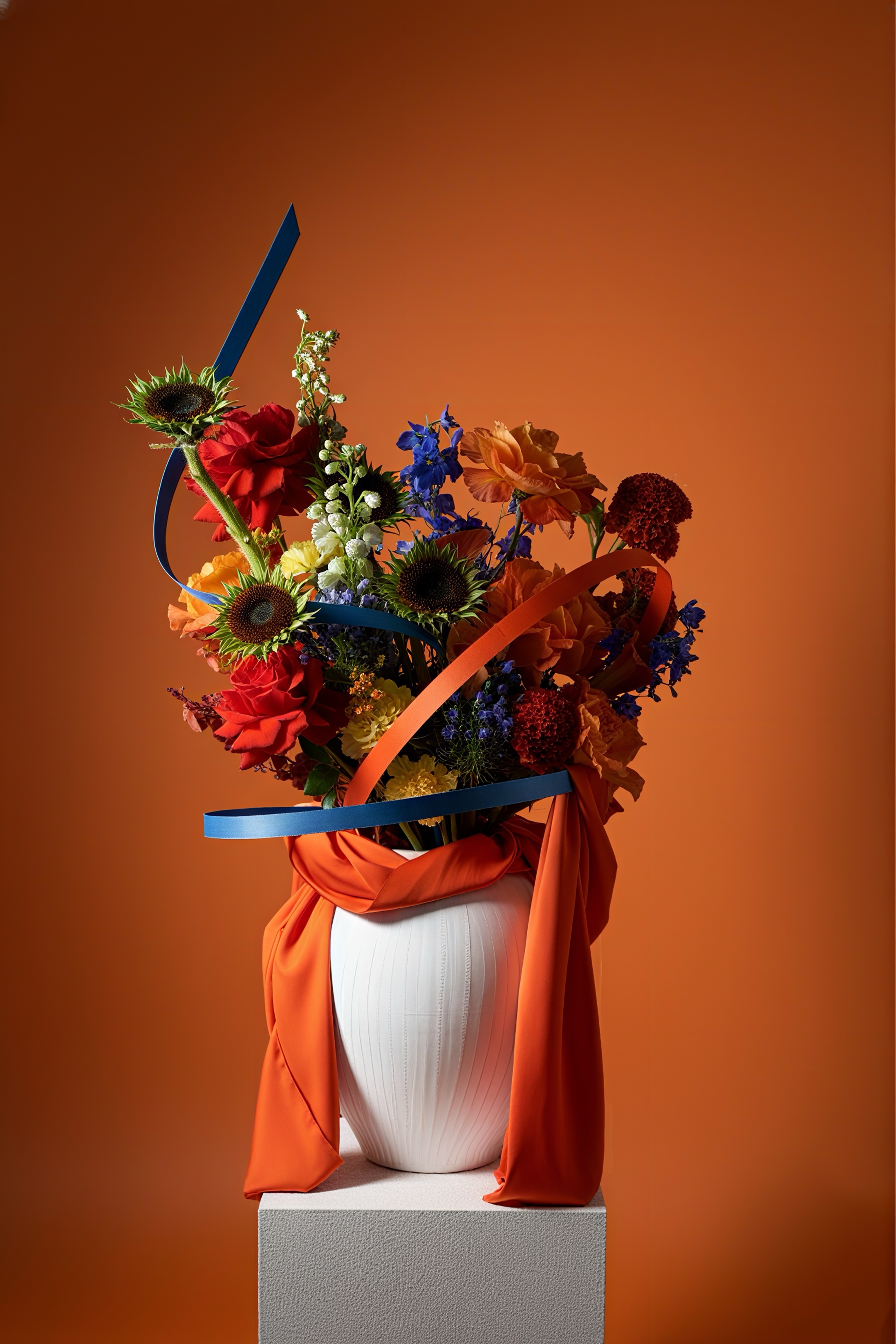 Inspired by Edvard Munch’s The Scream, this bold arrangement captures emotion through fiery sunflowers, orange roses, and celosia symbolizing chaos and passion.