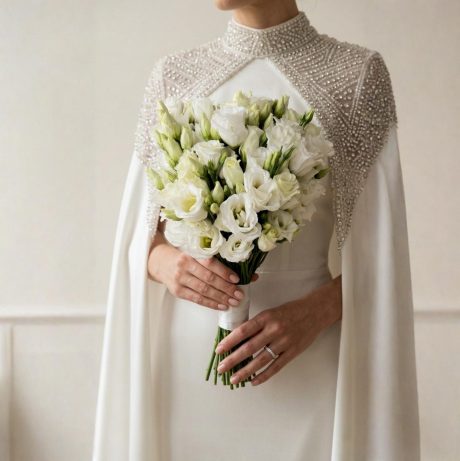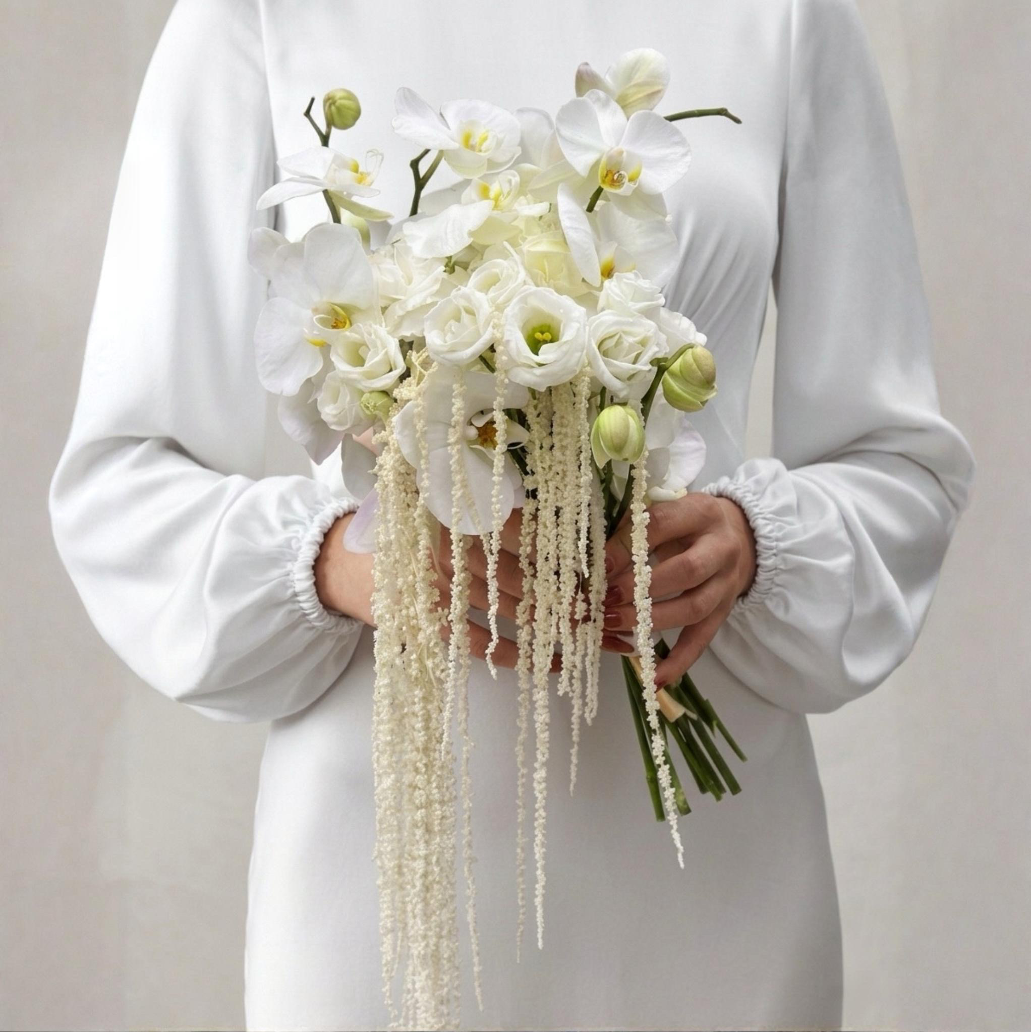 A graceful bridal bouquet featuring pristine white orchids, delicate white lisianthus, and flowing Amaranthus. This Bridal bouquet blends sophistication and soft romantic charm, with cascading textures that create an ethereal, modern look. Perfect for brides seeking elegance with a touch of drama.