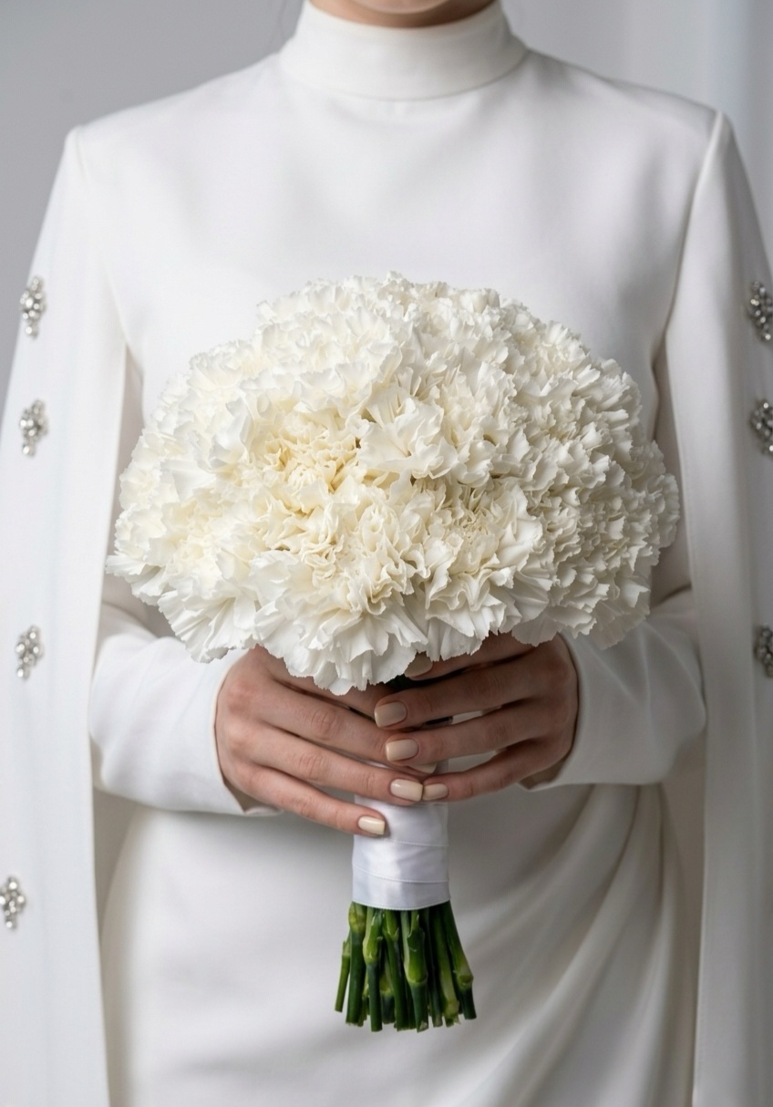 A beautifully soft and full bridal bouquet crafted entirely from white carnations. With its delicate texture and classic round shape, this bouquet offers a timeless expression of purity, simplicity, and refined elegance, perfect for a graceful wedding look.