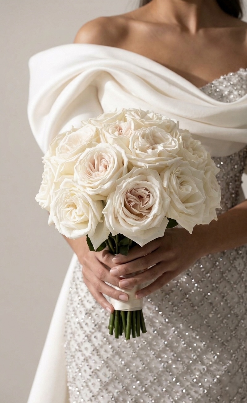 A timeless and elegant bridal bouquet featuring pristine white Ohara roses. Hand-tied to create a soft, romantic silhouette, this bouquet embodies purity, grace, and classic sophistication, perfect for brides seeking a refined and unforgettable wedding statement.