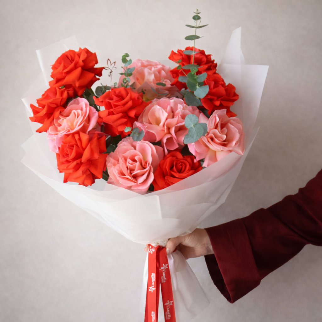 A refined bouquet featuring vibrant Nina roses paired with soft Hermosa roses, accented with eucalyptus foliage for a natural touch.