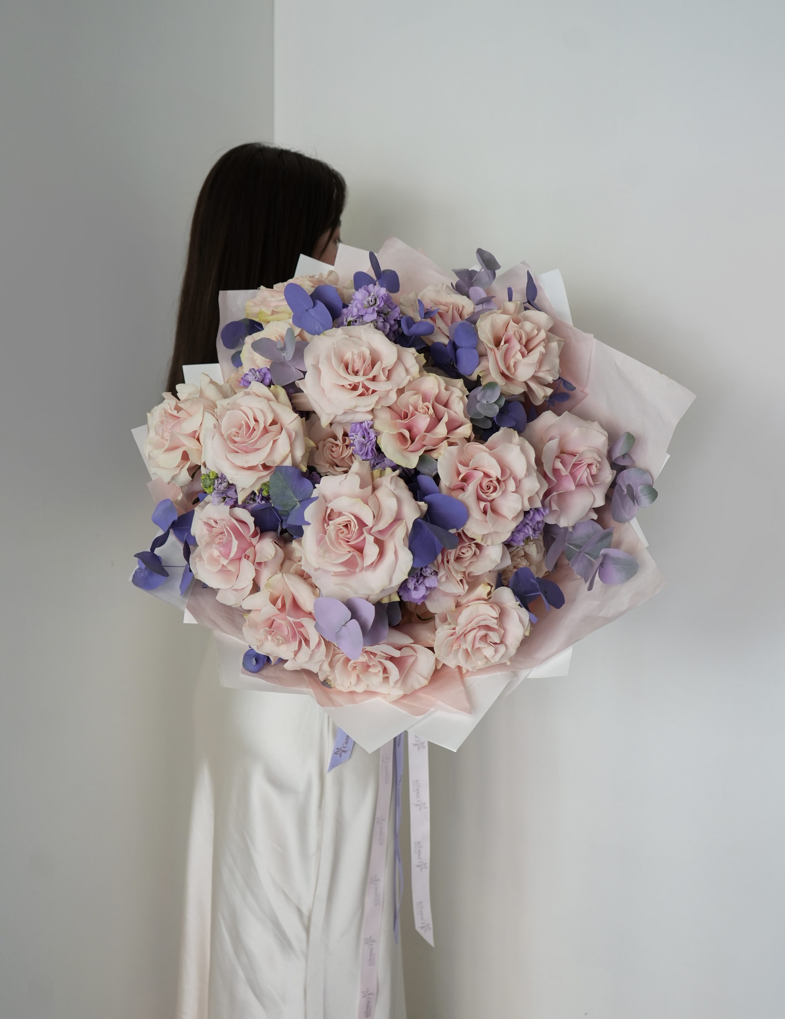 Soft Pink Mondial roses and rich purple foliage come together in this radiant bouquet, evoking the gentle glow of dawn. Rosaluz is a symbol of quiet elegance and delicate warmth.
