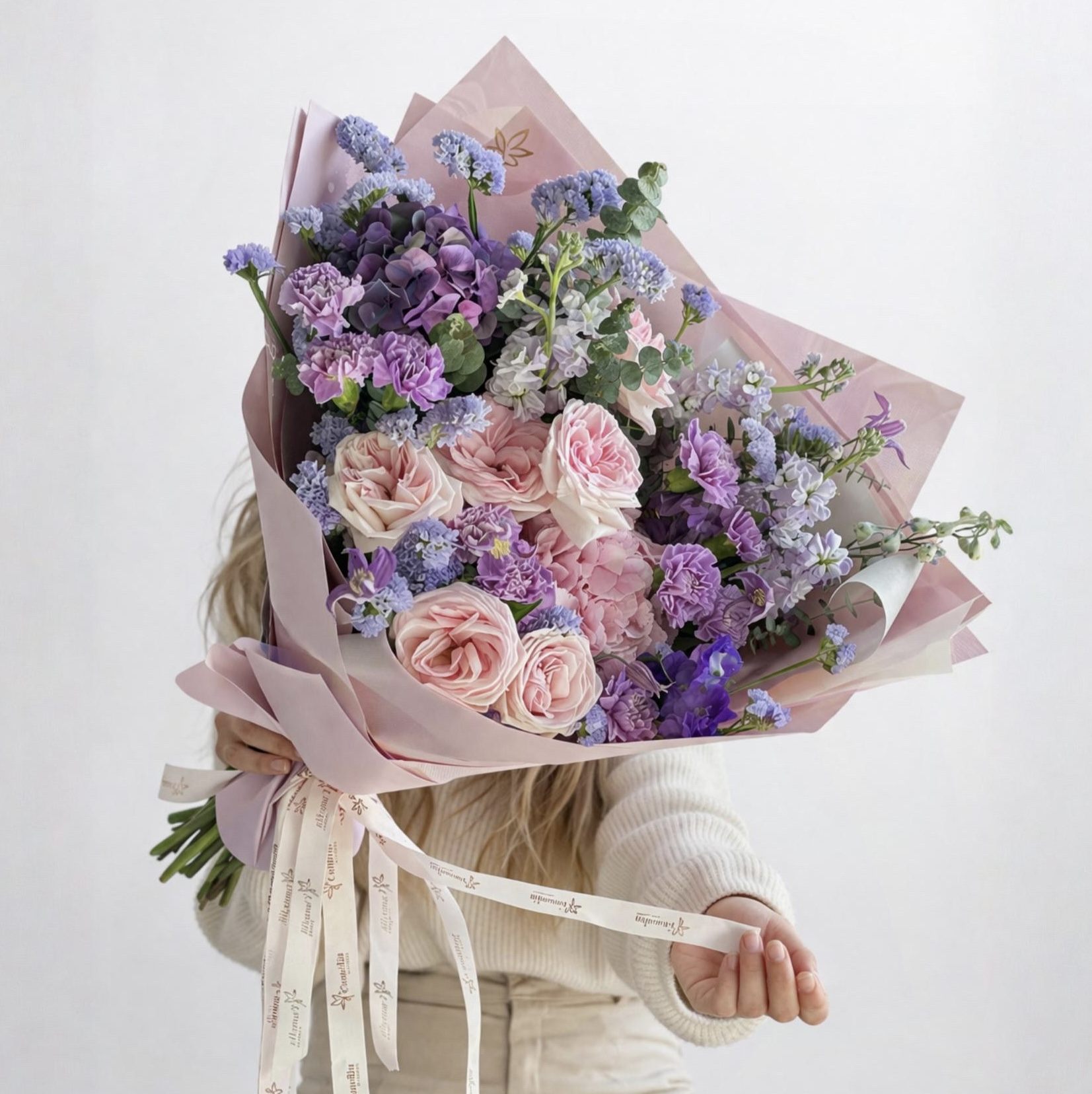 This soft and sophisticated arrangement combines delicate light pink flowers with rich purple accents, creating a harmonious blend of sweetness and luxury.