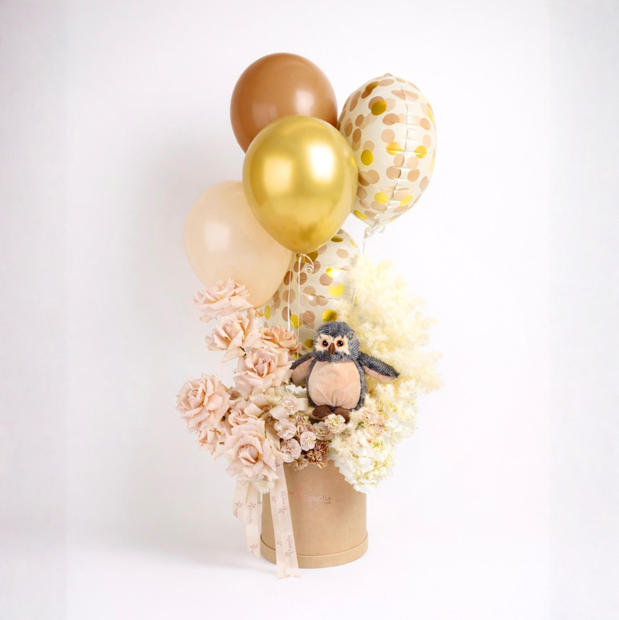 A soft and charming floral gift designed in warm neutral tones for a sweet and elegant welcome. Arranged in a medium box with balloons and a delicate owl toy, this design features spray carnation, Quicksand roses, white hydrangea, and white asparagus for a graceful mix of texture and softness. Gentle, refined, and full of warmth, Ari Owl Bloom Box is a beautiful choice for newborn gifting, baby visits, and thoughtful celebrations.