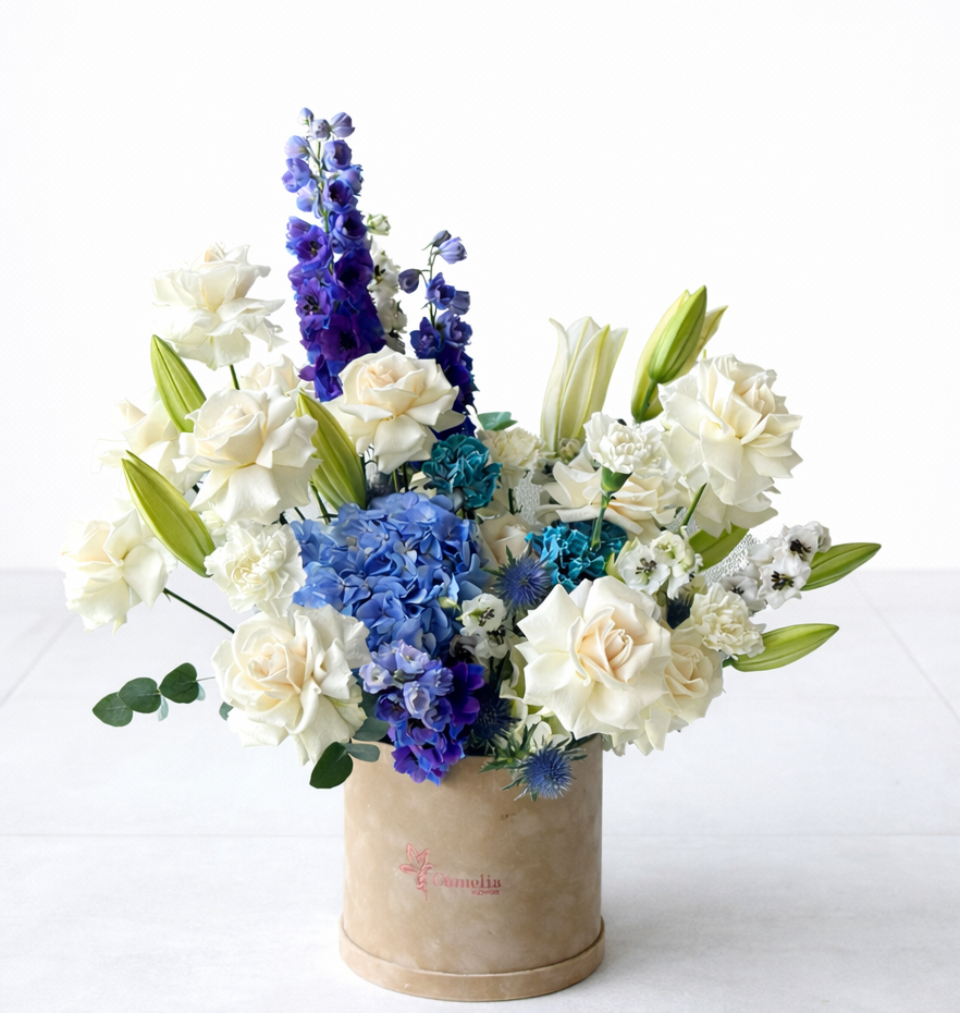 This stunning blue and white flower box arrangement combines the calming hues of blue with the purity of white blooms, creating a serene and sophisticated display. It features elegant white lilies, soft blue hydrangeas, and delicate white roses, thoughtfully arranged with lush greenery for a perfect balance of color and texture. The stylish box enhances the beauty of the flowers, making it a perfect gift for weddings, anniversaries, or any special occasion. With its peaceful and refreshing color palette, this arrangement brings a touch of tranquility and elegance to any space, making it a truly memorable gesture.