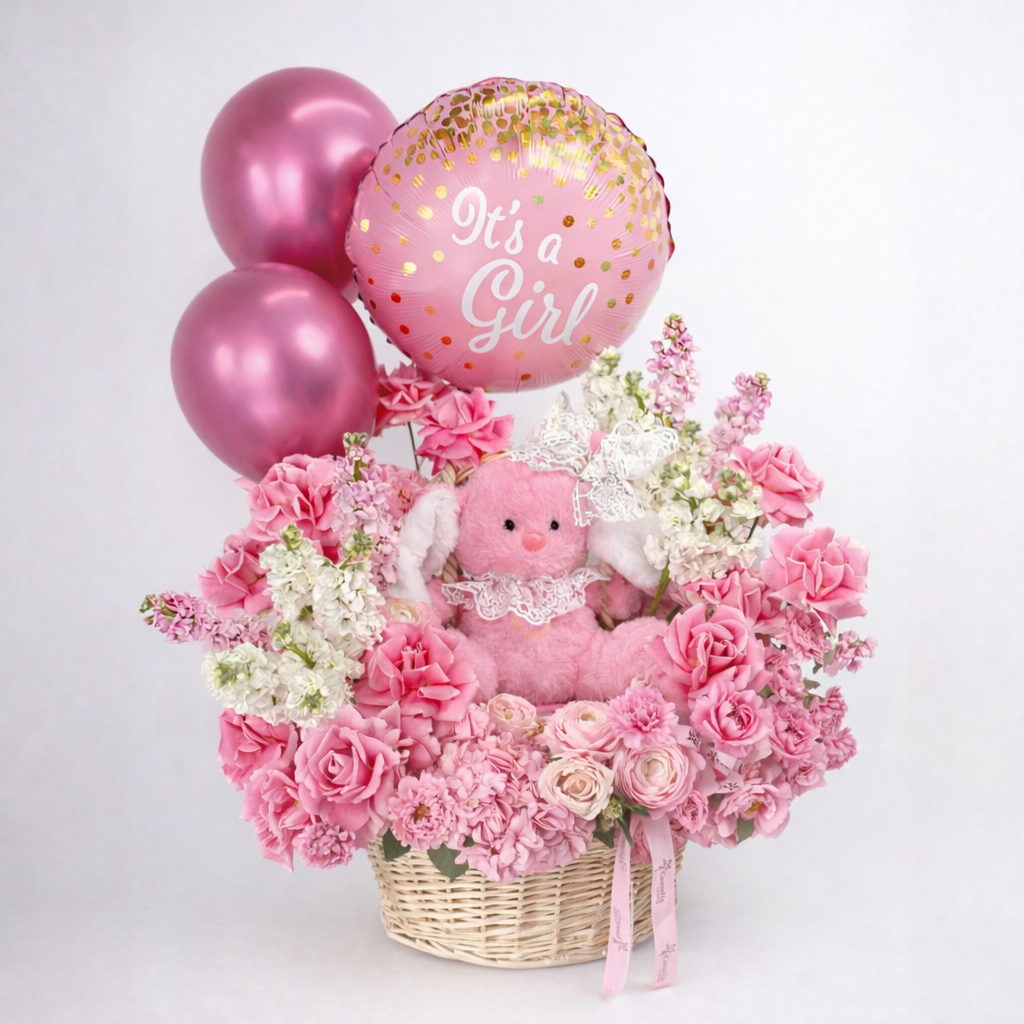A joyful baby girl arrangement designed to make every welcome feel extra special. Styled in a woven basket with a soft teddy bear and celebratory balloons, this charming design features Rosita, Pink Ranunculus, Mansfield Park, Pink Hydrangea, White Matthiola, Pink Matthiola, and Pink Carnation, finished with delicate lace details for an added touch of sweetness. Full of soft textures and elegant pink tones, Aurelia Baby Basket is a beautiful choice for newborn visits, hospital gifting, and precious baby girl celebrations.