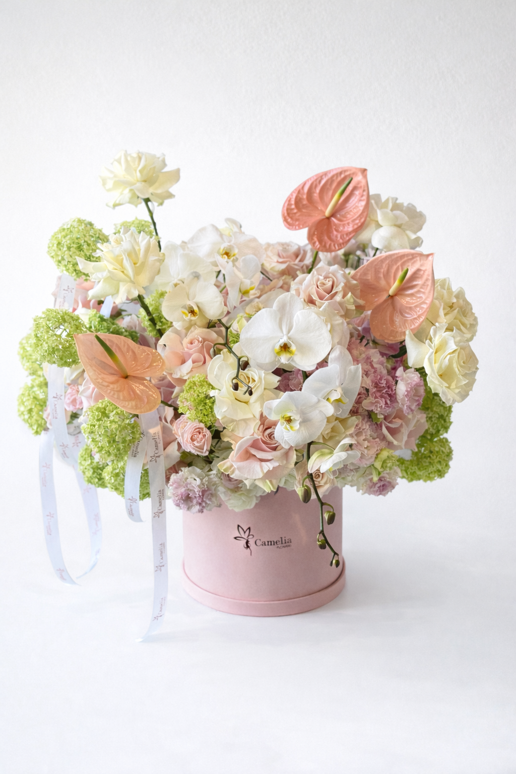 A luxurious blend of white orchids, blush roses, peach anthuriums, and fresh green accents arranged in Camelia’s signature box. Soft, refined, and effortlessly elegant — the perfect statement gift for any special occasion.