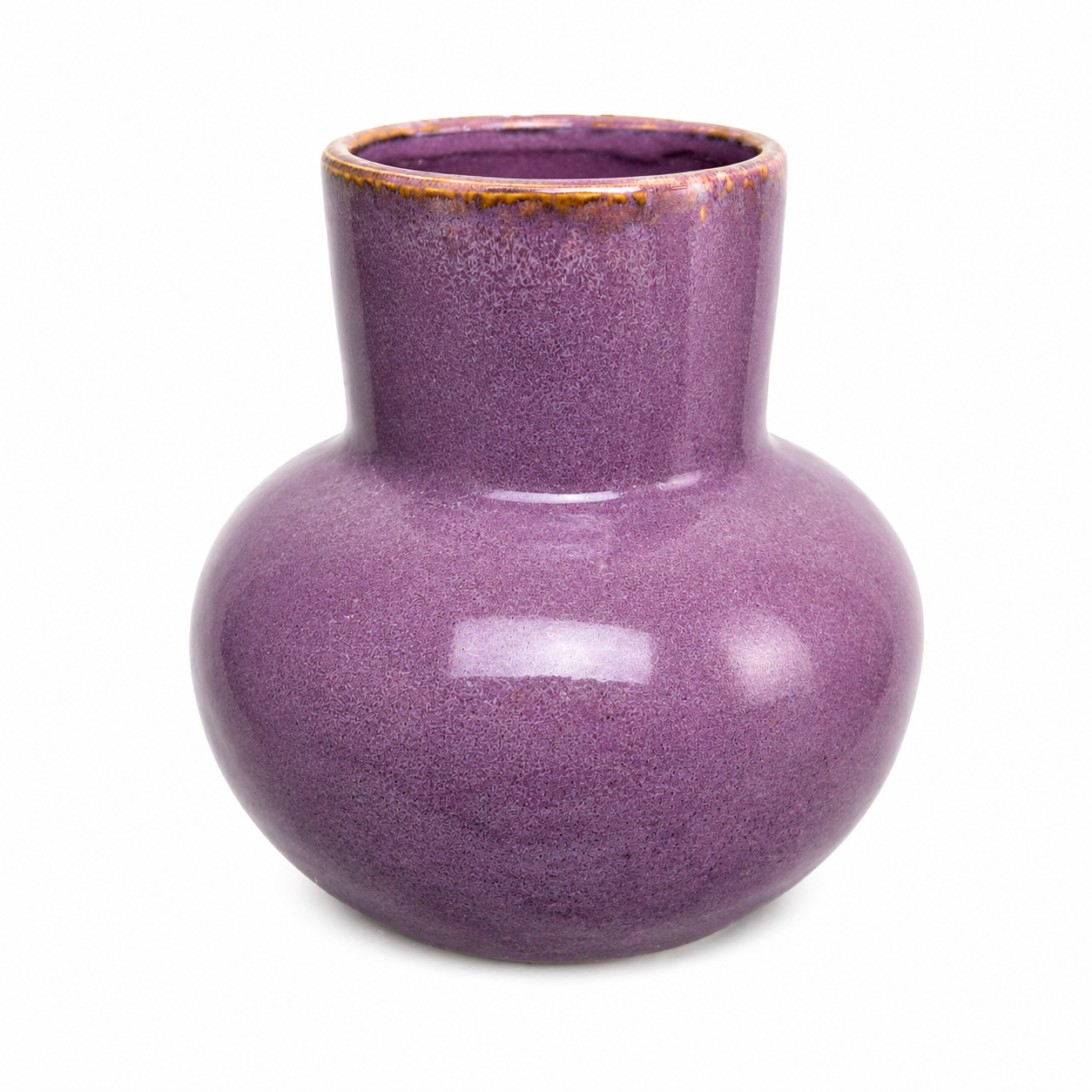 Add a rich pop of color to your collection with the Amethyst Orb Vase. This ceramic piece features a high-gloss, speckled violet glaze that offers a deep, multi-dimensional finish. Its classic rounded body and narrow neck are finished with a contrasting earth-toned rim, blending traditional pottery charm with a bold, modern palette.