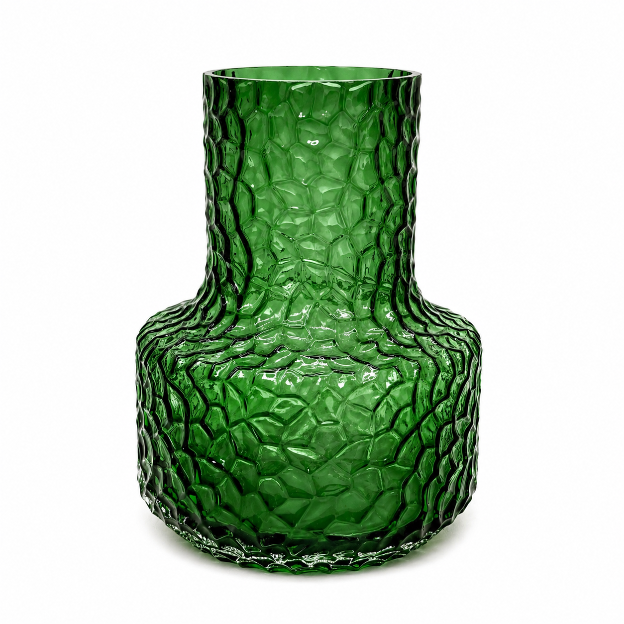 Infuse your home with the lush, vibrant energy of the Emerald Geometric Vase. This striking glass piece features a bold, industrial silhouette softened by an intricate, honeycombed texture. The deep forest-green glass captures and refracts light through its multi-faceted surface, creating a shimmering effect reminiscent of sunlight filtering through a dense canopy.