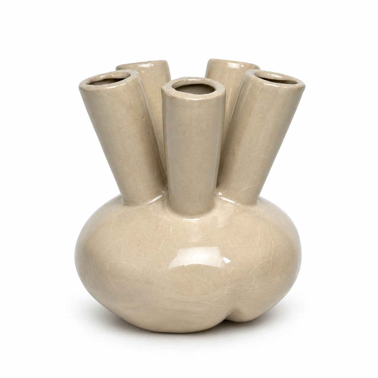 Introduce a touch of whimsical, organic design to your home with the Sandstone Sprout Vase. This creative piece features a unique multi-stem design, allowing you to showcase individual blooms in a playful, fan-like arrangement. Its soft beige glaze is accented with a delicate “crackle” finish, lending it a vintage, artisanal character.