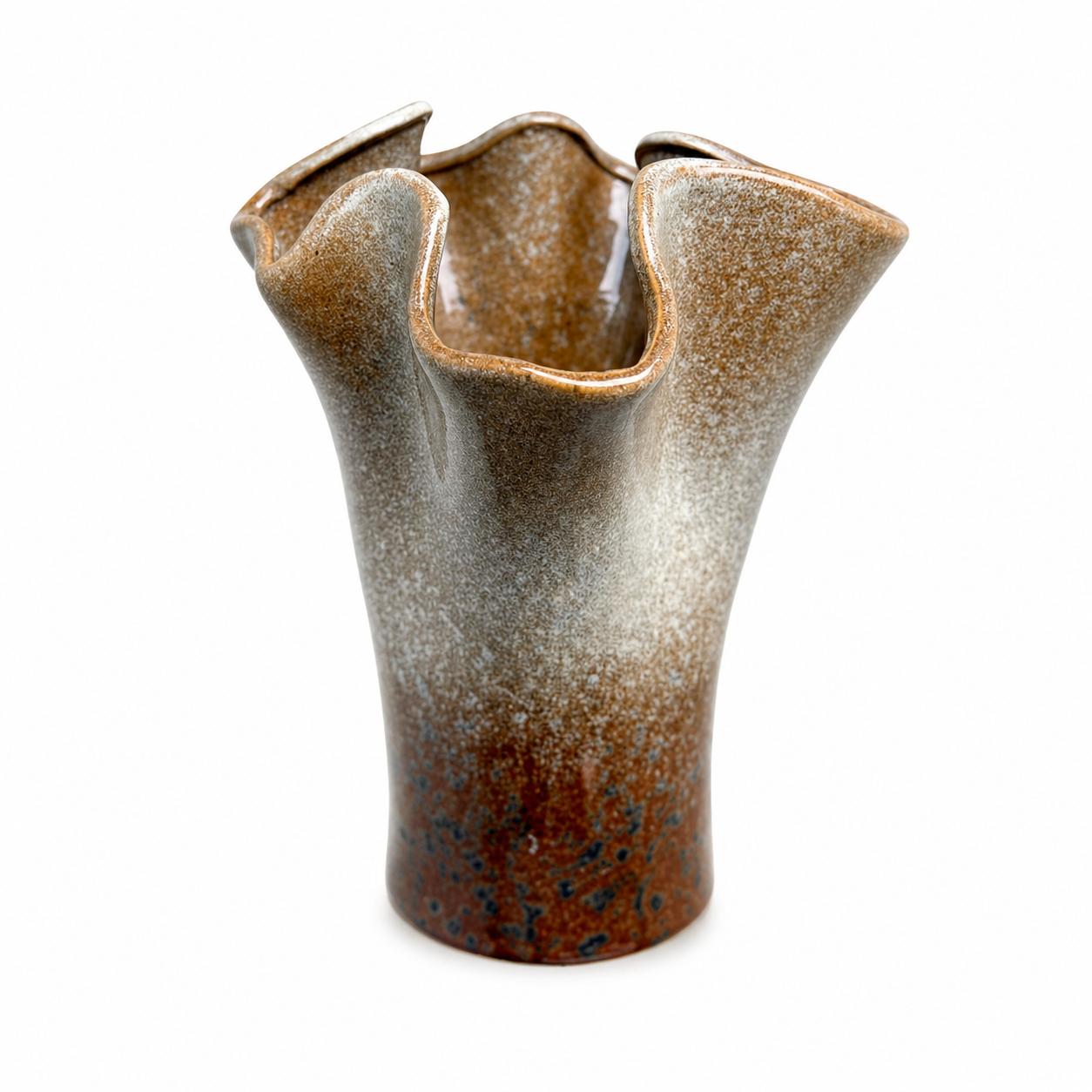 Add a touch of handcrafted, sculptural beauty to your home with the Sienna Wave Vase. This ceramic piece features a dramatic, ruffled rim that mimics the fluid movement of fabric or water. Its earthy gradient, transitioning from a deep terracotta base to a frosted stone grey, offers a rustic yet refined aesthetic.
