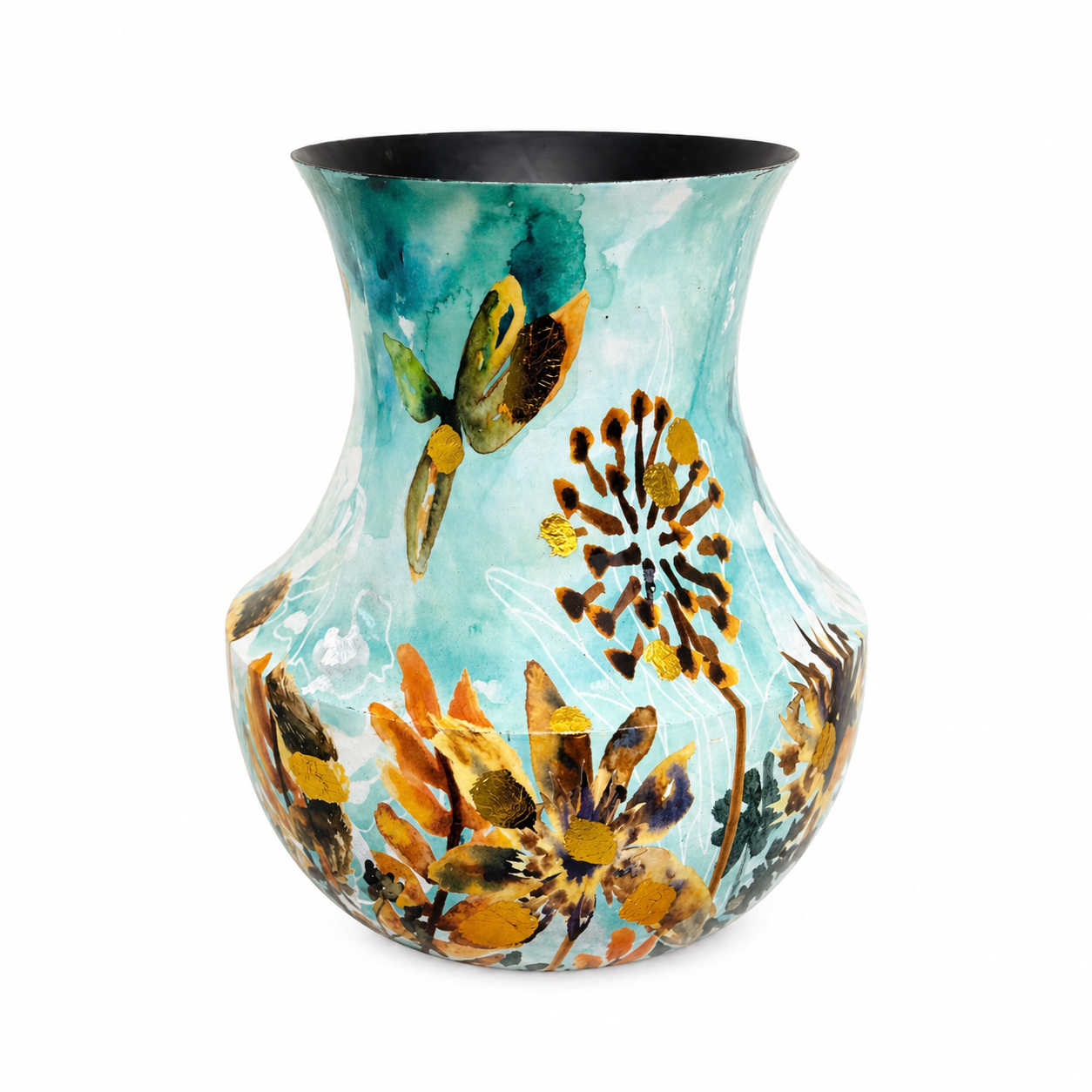 Bring the beauty of a sun-drenched field into your home with the Teal Meadow Vase. This artistic vessel features a serene teal wash background layered with earthy, hand-painted botanical motifs. Touches of textured gold leaf bring a luxurious, shimmering finish to the autumnal tones, making it a true work of art.