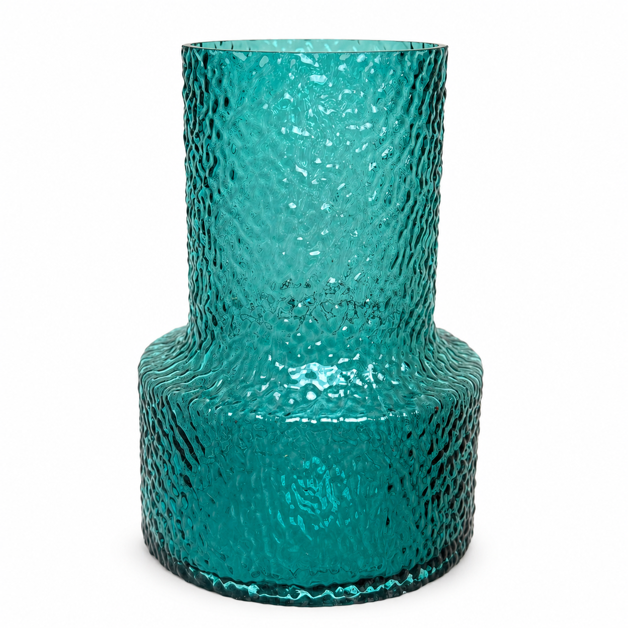 Add a refreshing splash of color to your interior with the Teal Ripple Vase. This piece features a bold, industrial-inspired silhouette softened by a shimmering, hammered glass texture that mimics sunlight dancing on tropical waters. Its vibrant turquoise hue and substantial base make it both a functional vessel and a standalone art piece.