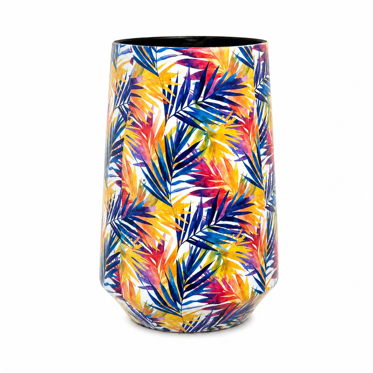 Bring a vibrant, sun-drenched energy to your interior with the Tropical Frond Vase. This striking vessel features a bold, all-over botanical print of palm leaves in a vivid palette of electric blue, sunset orange, and lush yellow. Its sleek, tapered silhouette provides a clean, modern canvas for the expressive and colorful design.