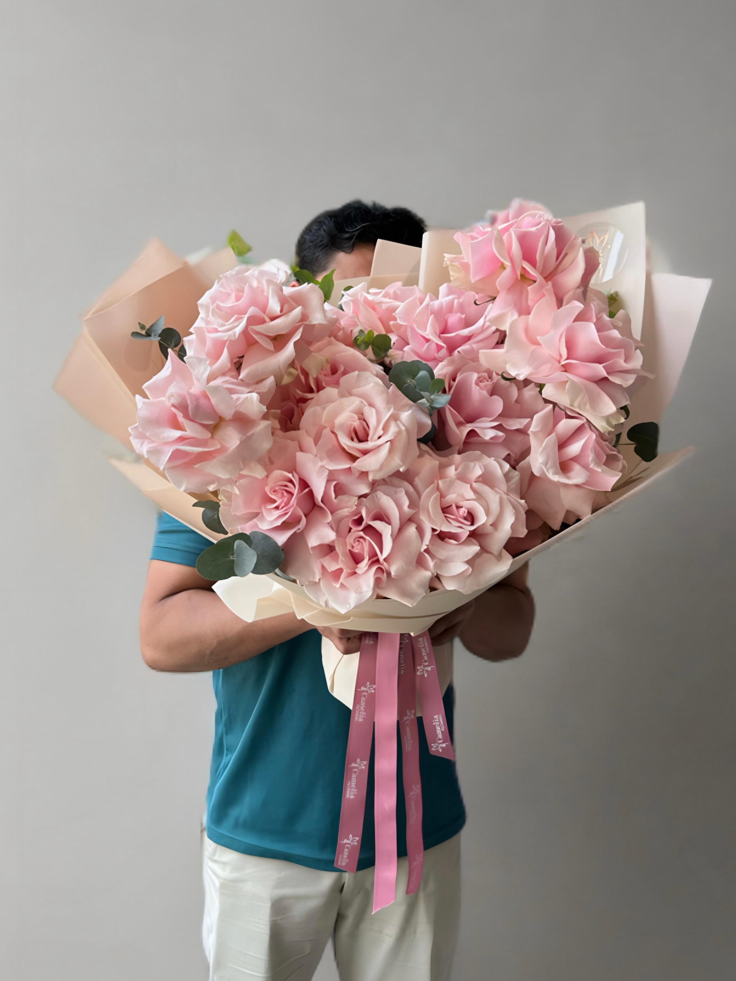 Where soft romance meets quiet mystery — a bouquet of Pink Mondial roses wrapped in elegance.