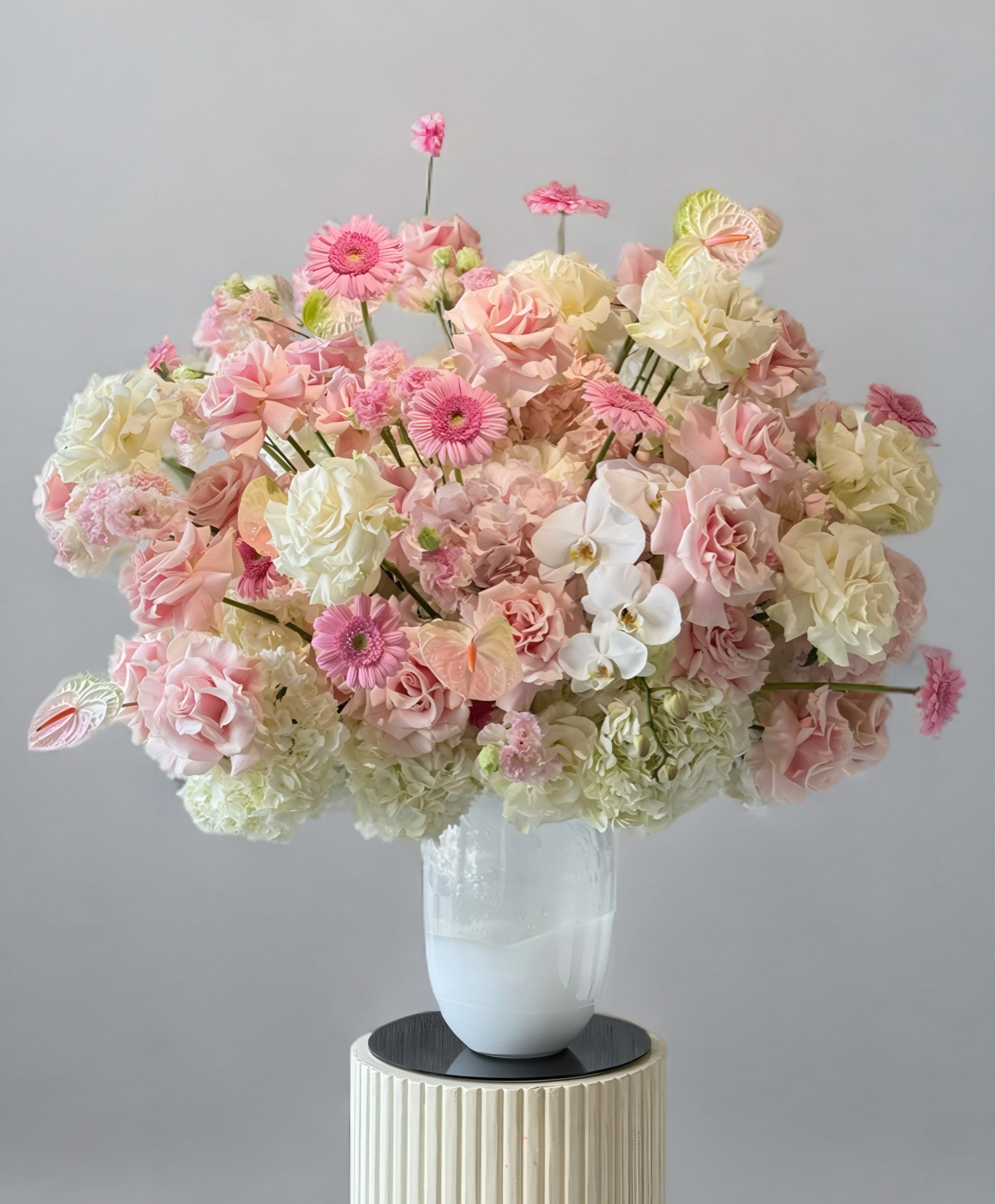 Cotton Blush is a dreamy arrangement that whispers elegance and warmth. Voluminous pink and white hydrangeas blend with tender Mondial roses, delicate lisianthus, and sculptural anthurium and orchids, creating a layered story of grace. ***We fully depend on the Floral Farms all around the World. If any flower is not available in the order, we will replace it with identically colored flowers, to keep same style and color combination.