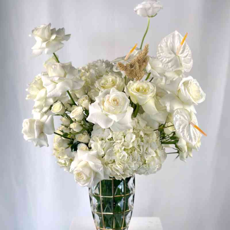 This pure and elegant white flower vase arrangement exudes simplicity and sophistication. Featuring crisp white lilies, elegant white roses, and soft white carnations, the arrangement is complemented with fresh greenery to add a touch of natural beauty.