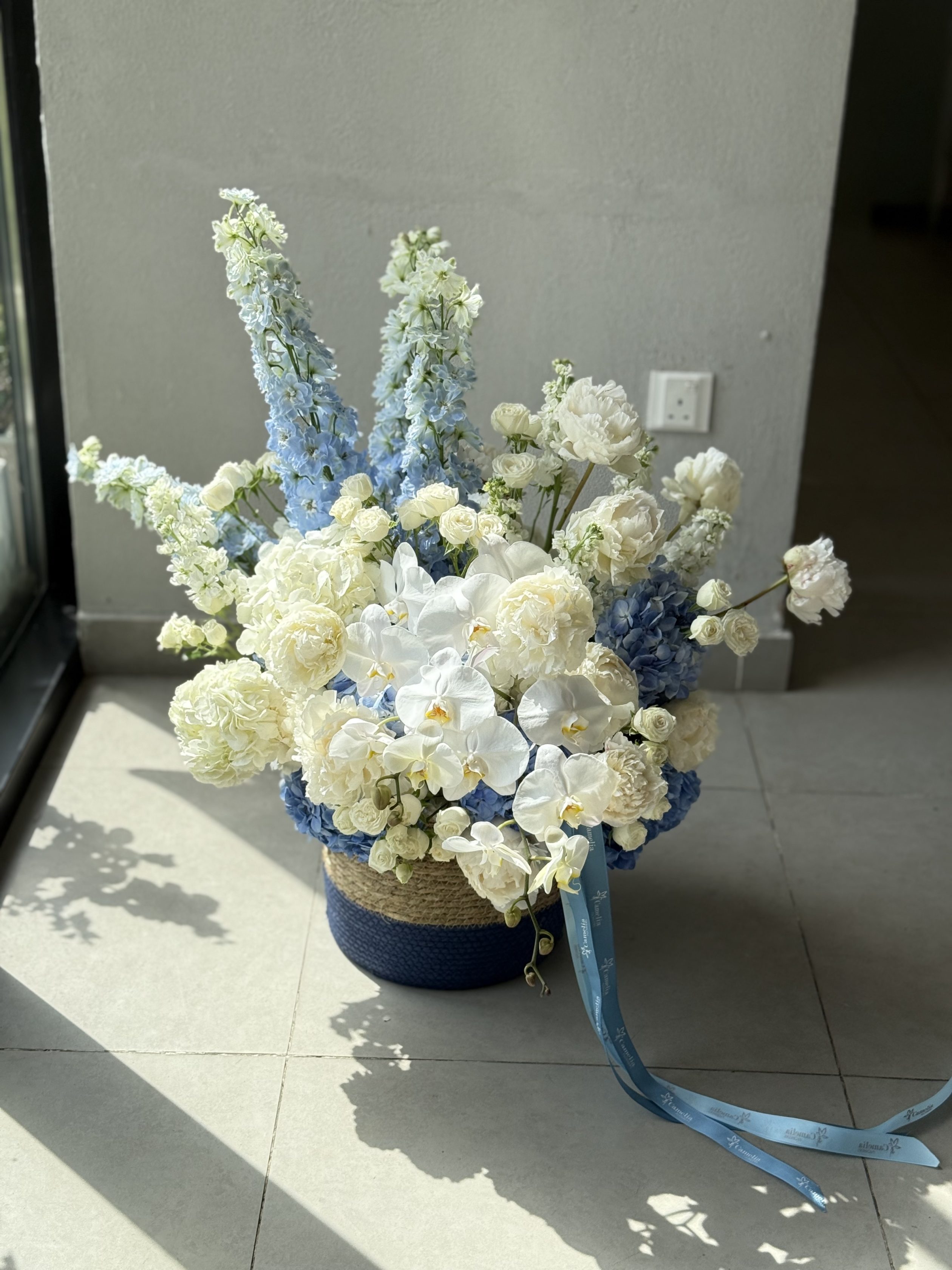 Winter Muse is a bouquet born of still skies and whispered elegance. Delphinium in celestial blue flows between snow-petal peonies, delicate mathiola, clouded hydrangea, creamy bombastic roses, and porcelain-like orchids.***We fully depend on the Floral Farms all around the World. If any flower is not available in the order, we will replace it with identically colored flowers, to keep same style and color combination.