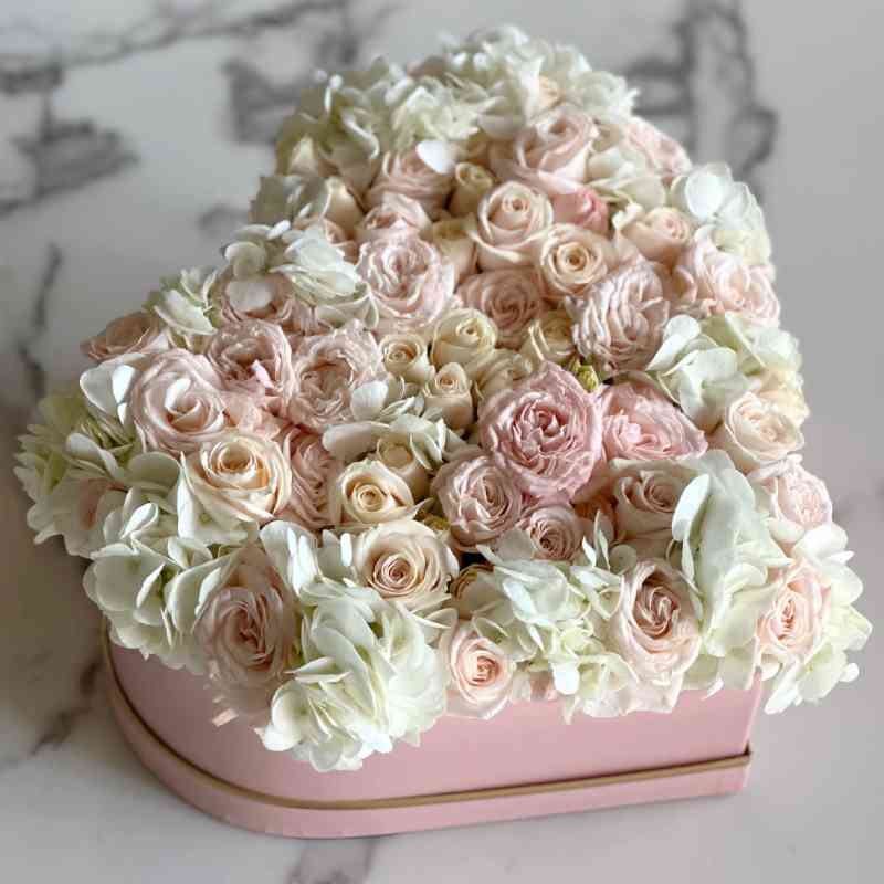 This enchanting heart-shaped box flower arrangement beautifully combines soft light pink and pure white blooms, creating a romantic and elegant display. Featuring delicate light pink roses, pristine white lilies, and soft pink carnations, the arrangement is complemented by lush greenery, adding depth and texture. The heart-shaped box enhances the sentimental charm of the arrangement, making it the perfect gift for anniversaries, weddings, or as a thoughtful gesture for a loved one. The gentle pink and white tones evoke feelings of love and tenderness, bringing a touch of romance and elegance to any space.