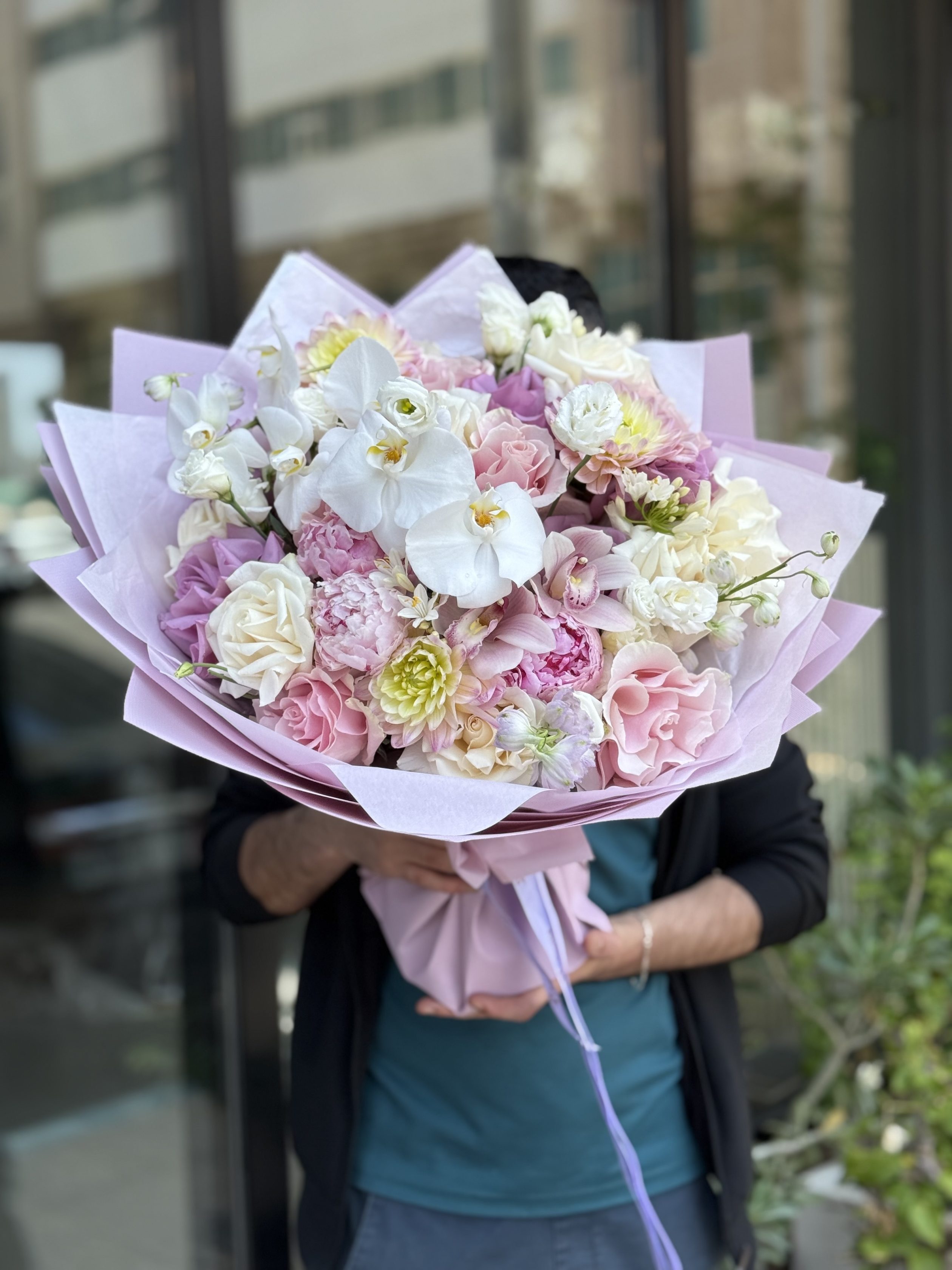 Velvet Glow wraps you in lush pink petals and creamy whites, accented by hints of purple—an arrangement full of warmth and subtle elegance.